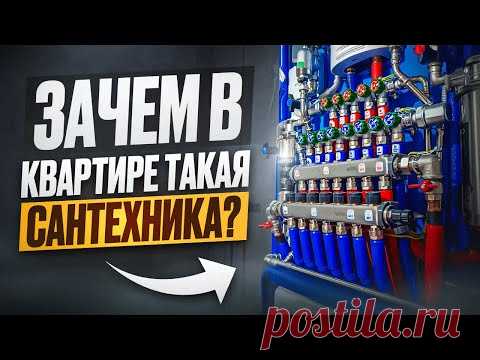На изображении представлена система водоснабжения или отопления с разноцветными трубами и вентилями. Надпись на русском языке гласит: "Зачем в квартире такая сантехника?". Фон тёмно-синего цвета с визуальным акцентом на трубах и соединительных элементах.
