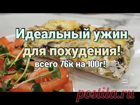 На изображении представлено блюдо, состоящее из кусочка запеченной еды, по виду похожей на запеканку или пирог, с листьями зелени сверху, и салатом из помидоров и рукколы на переднем плане. Надпись на русском языке гласит: "Идеальный ужин для похудения! всего 76к на 100г!", что предполагает, что это блюдо низкокалорийное и подходит для диеты.