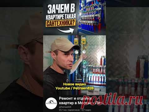 На изображении представлен мем или рекламный постер, где мужчина смотрит на стенд с различными видами сантехнического инструмента и материалов. На стенде множество труб, фитингов, запорной арматуры и других предметов. В верхней части изображения присутствует текст на русском языке: "ЗАЧЕМ В КВАРТИРЕ ТАКАЯ САНТЕХНИКА?". Также есть упоминание YouTube канала с названием "Petersen828". В нижней части картинки находится логотип и информация, вероятно, о компании или услугах связанных с ремонтом и обустройством квартир.