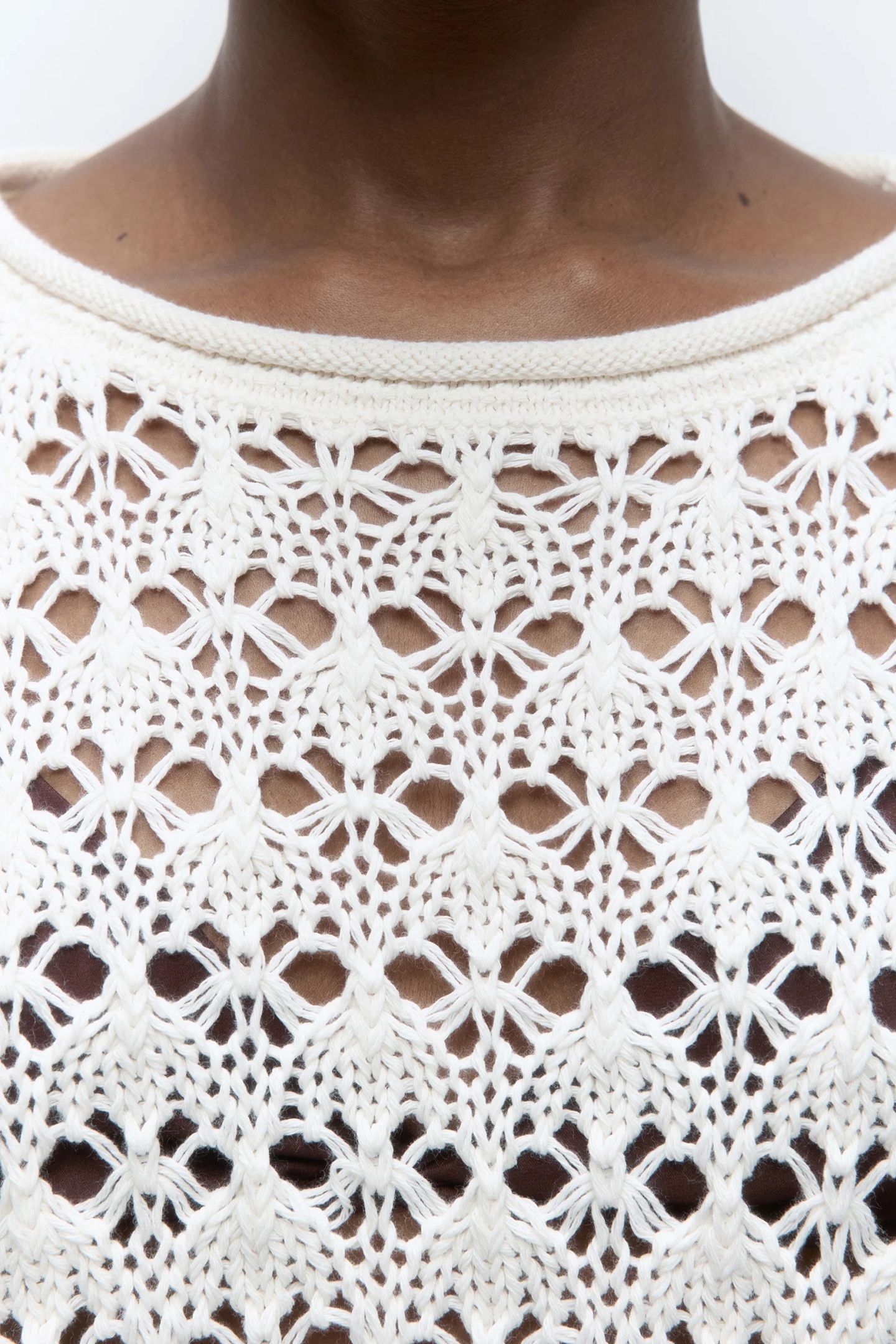 Крупный план вязаной белой кружевной ткани с открытыми узорами, изображение также показывает часть человеческого тела на заднем плане.