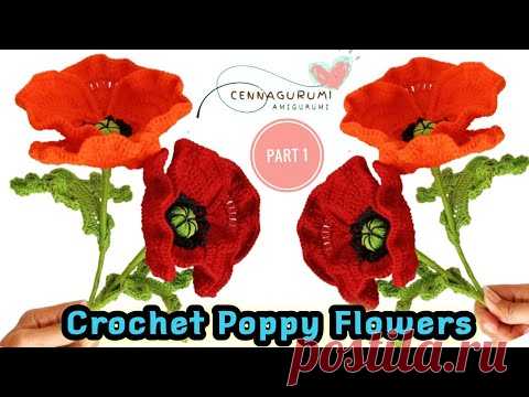 Вязаные крючком цветы мака с зелеными стеблями и листьями. Изображение включает текст, указывающий на часть учебного материала и веб-сайт.