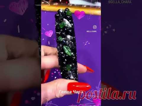 В кадре женская рука с красивым маникюром, она держит волшебную палочку или посох, украшенный черными кристаллами с вставками зеленого цвета. Предмет снимают крупным планом, вокруг видны символы в виде сердец и надписи, что дает понять, что это видео или фото обработано с помощью мобильного приложения или программы для редактирования.