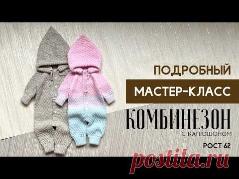 На изображении представлены два вязаных детских комбинезона с капюшонами - один серого цвета, другой розового, выложенные на светлом фоне. Надпись на изображении гласит: "подробный мастер-класс комбинезон с капюшоном рост 62 postila.ru", что указывает на то, что это изображение может быть обложкой или анонсом мастер-класса по вязанию комбинезонов, опубликованного на русскоязычном ресурсе.