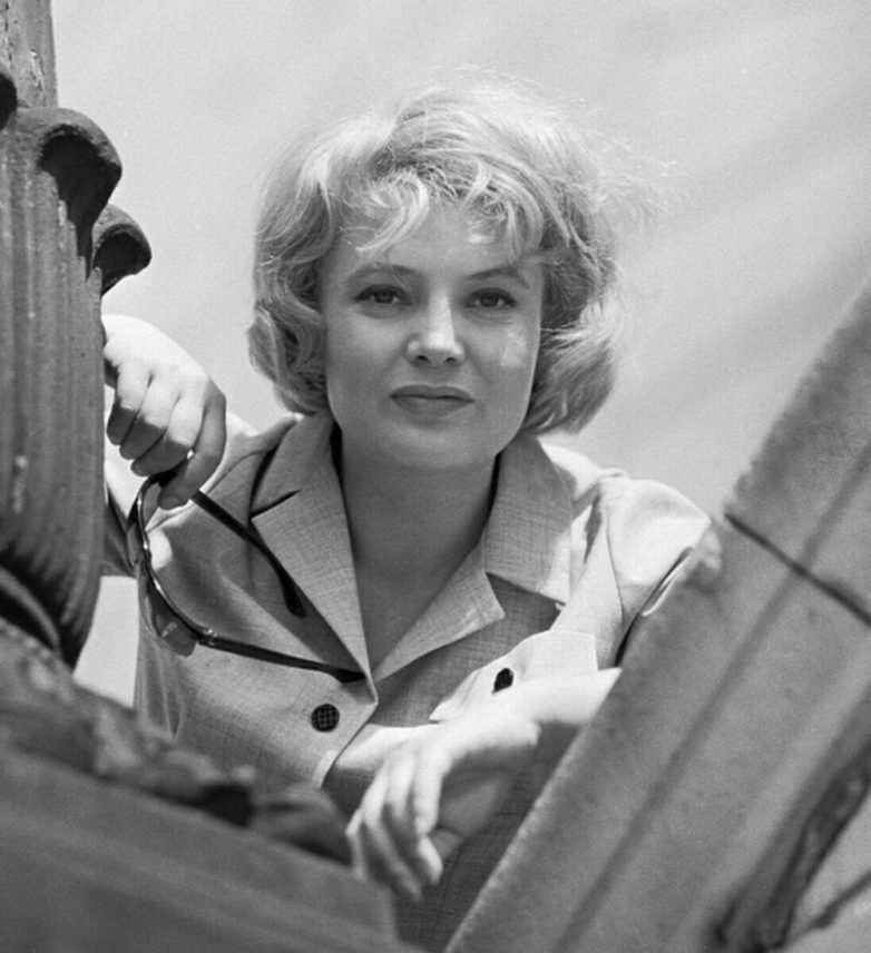 На черно-белом изображении женщина средних лет с короткими волосами. Она улыбается и смотрит прямо на камеру. Женщина одета в светлое пальто, стиль которого указывает на прошлые декады, что подчеркивает винтажный аспект фотографии. Она облокотилась на нечто, напоминающее верхнюю часть деревянного забора или балюстрады.