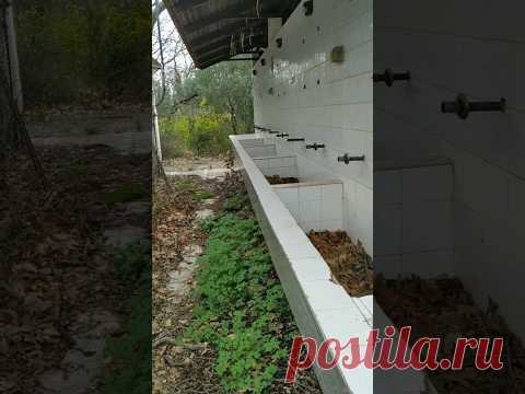 Изображение показывает уличную сцену с длинной желобоподобной конструкцией, прикрепленной к стене под навесом. Конструкция кажется наполненной землей или мусором и ведет к лесистой местности.