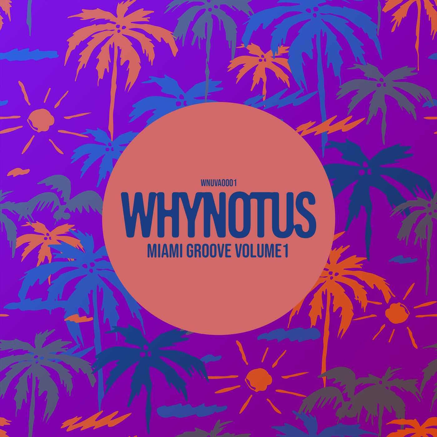 Обложка альбома с пальмами и надписью WHYNATUS MIAMI GROOVE VOLUME 1 на фоне в стиле ретро с пурпурными и оранжевыми оттенками.