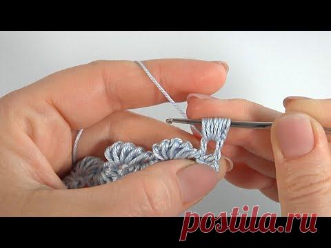 Руки, которые вяжут крючком. В воздухе находится серая пряжа, и видно, как из неё формируется текстильное изделие.