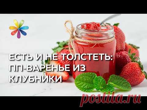 На изображении представлен баночка с клубничным вареньем, окруженная свежими клубниками и листьями мяты. Текст на изображении гласит: "Есть и не толстеть: пп варенье из клубники", что указывает на низкокалорийный продукт, предназначенный для диетического питания.