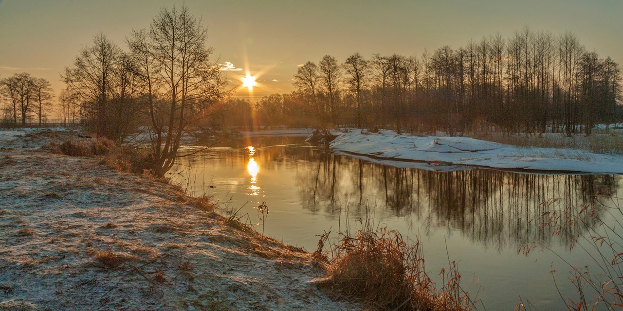 Закат или рассвет над рекой, окружённой лесом и полями с остатками снега. Отражение солнца видно на воде, создавая живописный пейзаж.