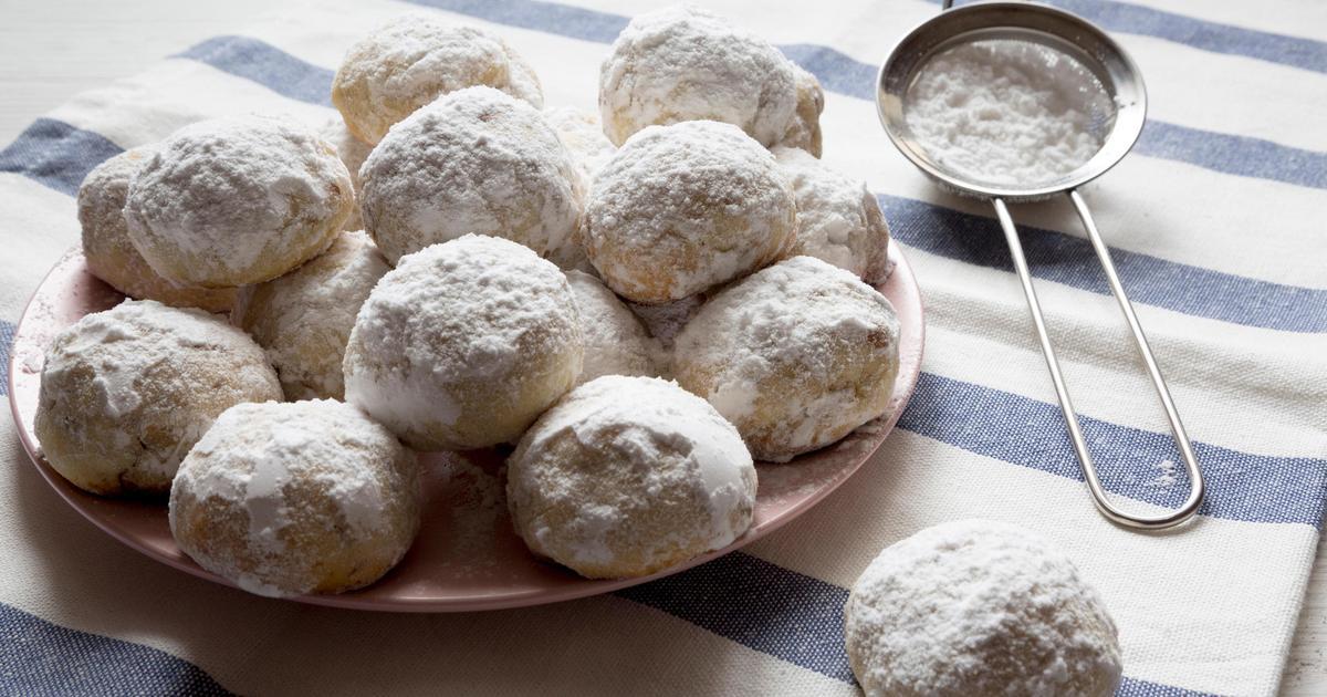 На изображении присутствует плоское блюдо с пышными печеньями, обсыпанными сахарной пудрой. Рядом лежит металлический ситечко для сахарной пудры. Всё это расположено на скатерти с полосатым узором. В правом нижнем углу изображения можно заметить логотип "postila.ru".