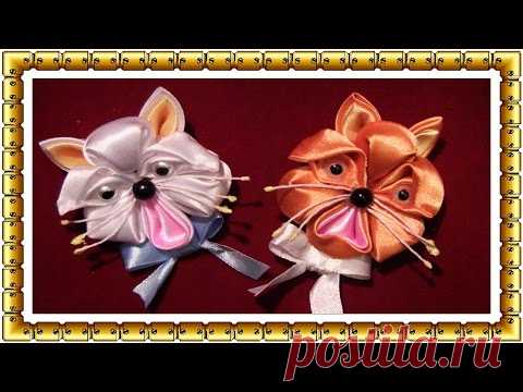 На изображении представлены два мастерски сделанных поделки в виде котов, сделанные из ленточек. Они стилизованы и украшены элементами, такими как бусинки для глаз и усики, чтобы создать милый и запоминающийся вид.