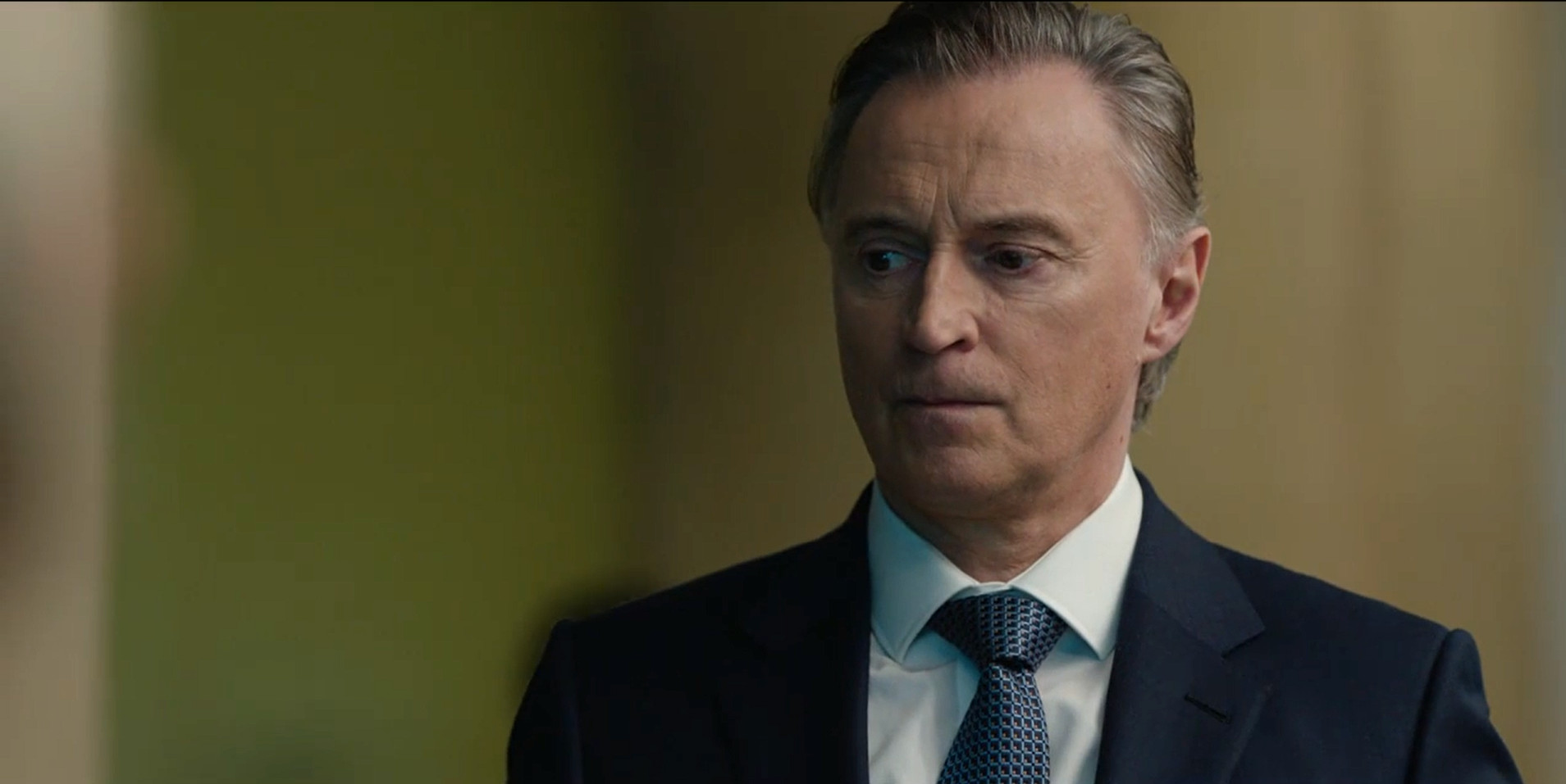 На изображении мужчина в деловом костюме с галстуком. У него серьезное выражение лица и аккуратно уложенные волосы. Фон размыт, скорее всего это кадр из фильма или телевизионного шоу.
