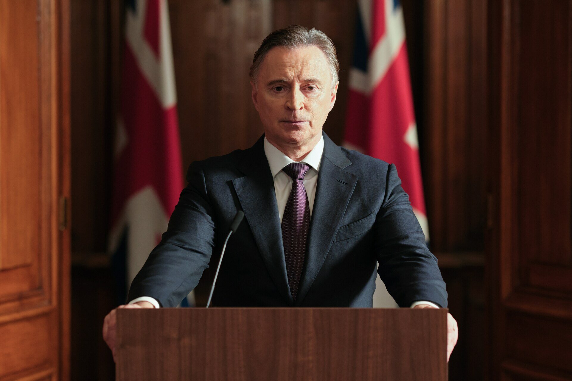 Мужчина в костюме и галстуке стоит за трибуной с микрофонами в официальном зале с флагами на фоне.