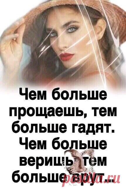 Изображение женщины в шляпе с надписью на русском языке, которая гласит: "Чем больше прощаешь, тем больше радишь. Чем больше веришь, тем больше получаешь."