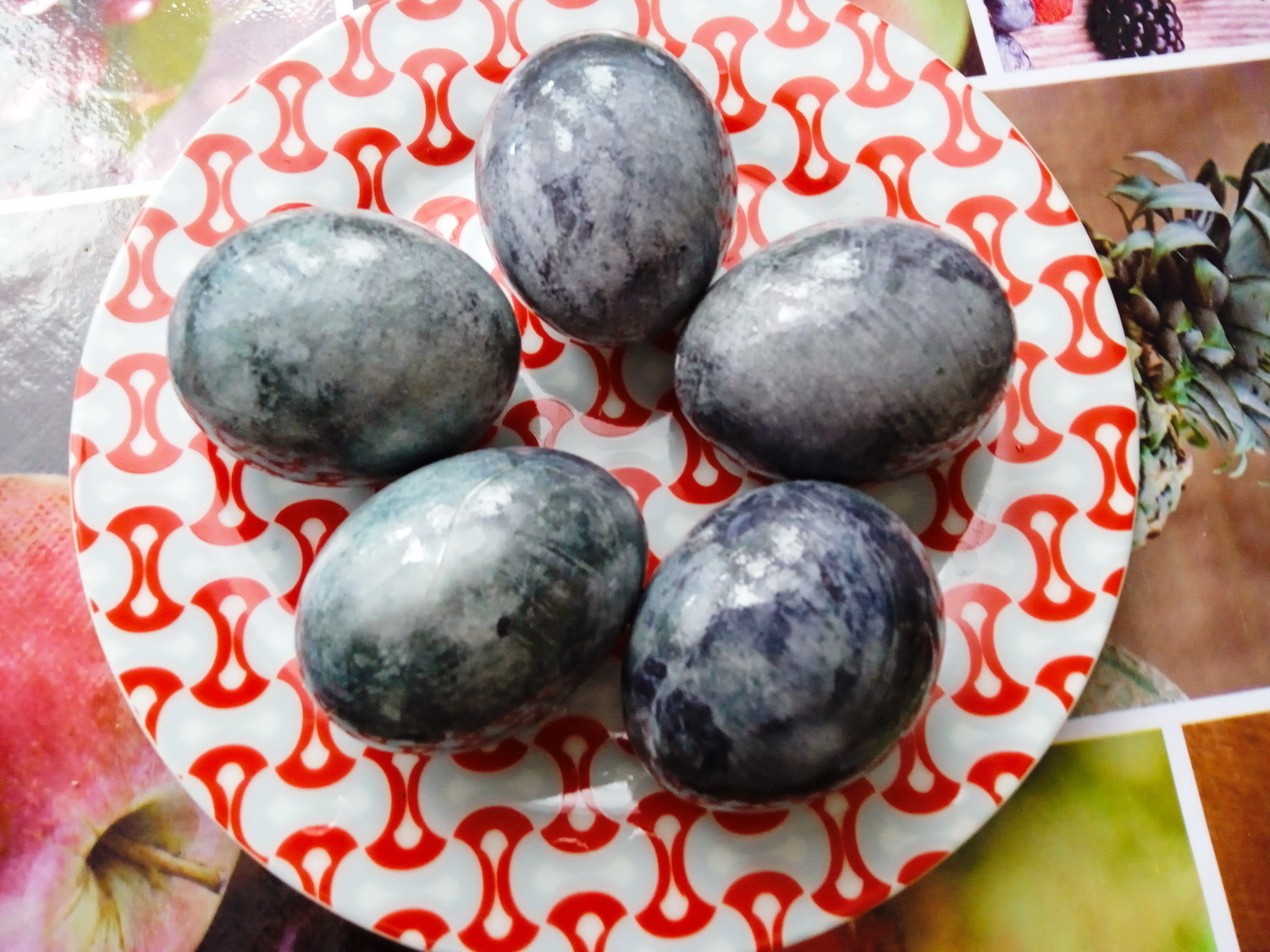 На изображении представлены пасхальные яйца, окрашенные в темно-синий цвет, которые лежат на тарелке с орнаментом.