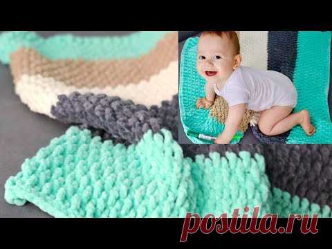 На изображении виден младенец, ползущий на светлом коврике возле цветных вязаных ковров. Ковры имеют различные оттенки: голубой, бежевый, серый и мяту. Это выглядит как реклама домашнего текстиля или товаров для детей.