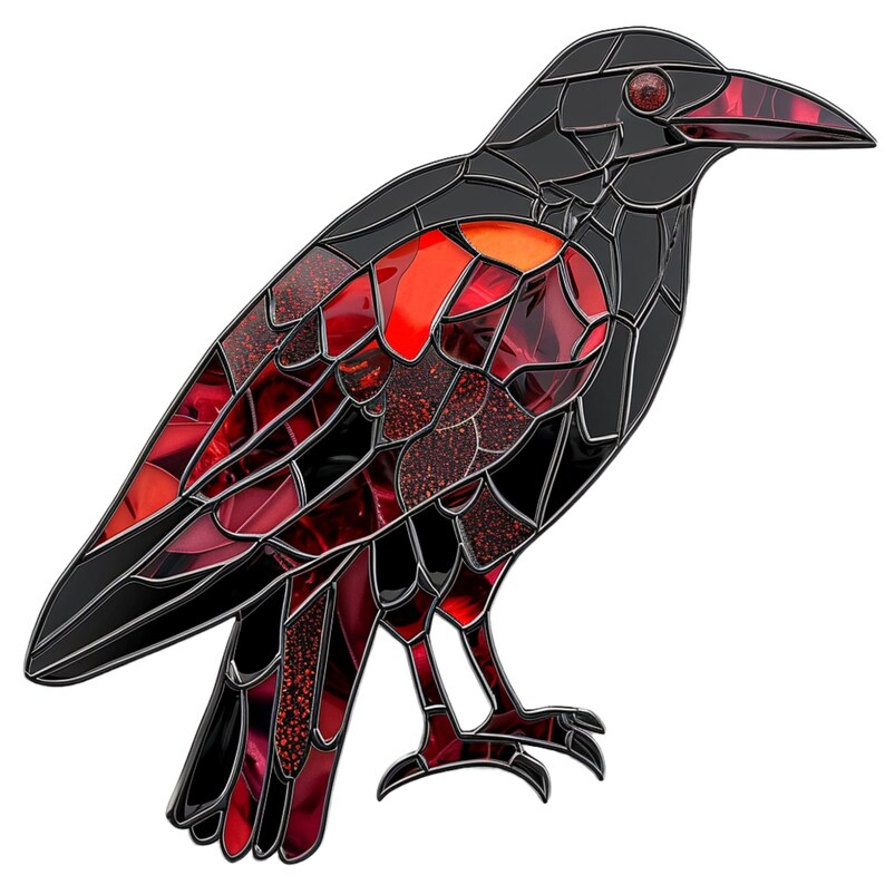 Изображение в стиле витража, на котором изображена ворона с красными и черными элементами.