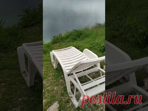 На переднем плане изображены пластиковые шезлонги на берегу, за которыми видна трава и вода водоема, наверное озера или реки. Небо затянуто тучами, предвещая возможный дождь.