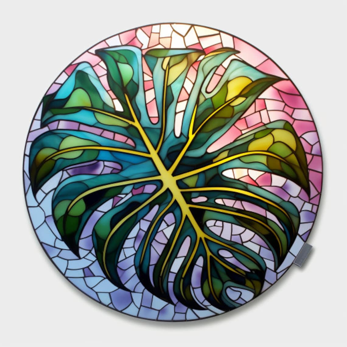 Круглая витражная роспись с изображением листьев монстеры на фоне разноцветных узоров.