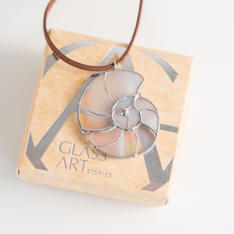 На изображении представлено стеклянное украшение в форме цветка, подвешенное на кожаном шнурке. Украшение находится на упаковочной бумаге с надписью "GLASS ART STORIES".