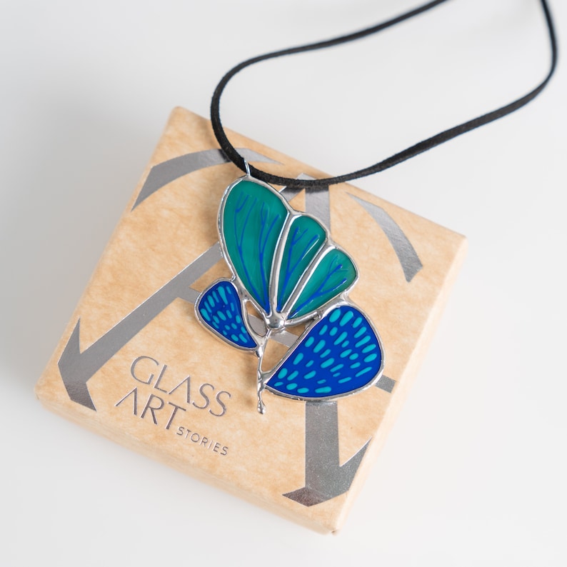 В изображении представлен красочный бабочковый кулон из стекла на черном шнурке, который лежит на бумажной упаковке с надписью "GLASS ART STORIES". Упаковка украшена серыми графическими элементами.