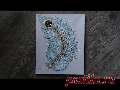 На изображении представлена картина с изображением павлиньего пера на холсте. Перо выглядит реалистично, с детализированными оттенками синего, зеленого и желтого цветов, а также чёрным «глазом» в верхней части. Фон холста белый, а под ним видна темно-серая деревянная поверхность. Это произведение искусства может быть выполнено в масляной или акриловой краске.