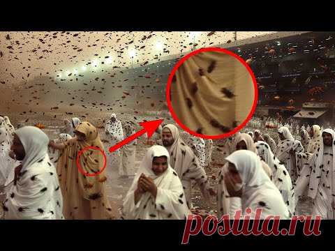 На изображении видна группа людей в белых одеждах со спотами, которые, похоже, находятся в панике или стрессе из-за обилия насекомых, летящих в воздухе. На переднем плане один человек отчётливо выражает ужас, а на изображении есть красные окружности и стрелки, указывающие на насекомых.