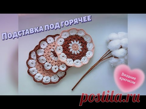 На изображении представлена подставка под горячее, выполненная в технике крючком. Она имеет круглую форму с узором, сочетание коричневого, белого и розового цветов. Рядом лежат веточки с хлопком, и есть сердце с надписью "Вязаное крючком". Фон изображения нейтральный.