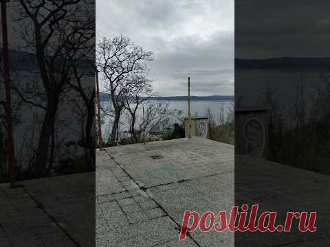 На изображении представлена пешеходная дорожка ведущая к видовой площадке с видом на водоем. На горизонте виднеются горы, а погода кажется пасмурной. Два дерева без листвы обрамляют путь, подчеркивая сезонность, возможно, это ранняя весна или поздняя осень.