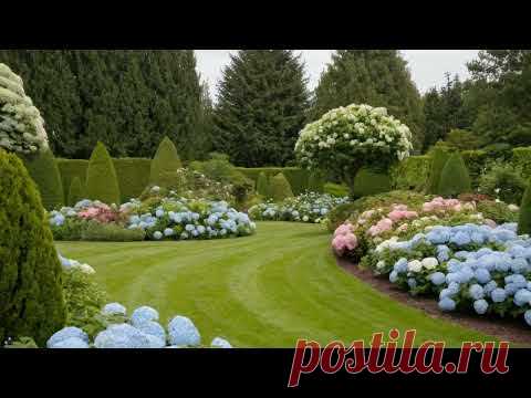 Красиво ухоженный сад с зеленым газоном, окруженный разноцветными гортензиями и аккуратно подстриженными кустарниками.