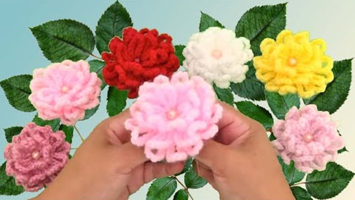 На изображении видны руки человека, держащие вязаный цветок. Вокруг них размещены другие вязаные цветы разных цветов и размеров с зелеными листьями на фоне в голубых и белых тонах.
