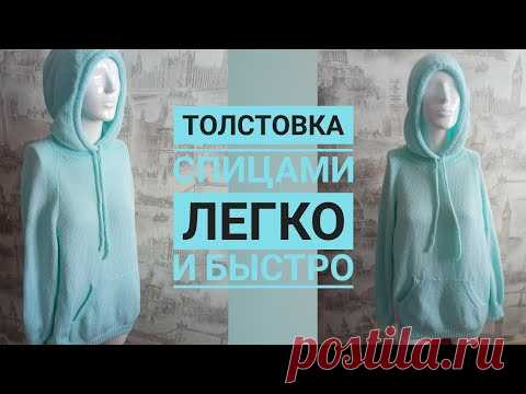 На изображении представлена толстовка на манекене. Перед на ней нанесен текст на русском языке, который гласит: "ТОЛСТОВКА СПИЦАМИ ЛЕГКО и БЫСТРО". Фон изображения представляет собой размытую текстуру, а сама толстовка имеет мягкий голубой цвет.