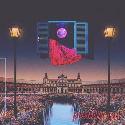 На изображении нарисована фантазийная сцена с плавающим в воздухе окном, через которое видно космическое тело, похожее на планету. Окно выглядит как будто оно открыто изнутри темной комнаты. Под окном видна большая красная ткань, кажется падающей или парящей в воздухе. В нижней части изображения изображена площадь с архитектурными строениями, напоминающими европейские дворцы, окруженная большим скоплением людей. В воде перед площадью отражается звездное небо, хотя само небо не показано. Композиция дополнена двумя уличными фонарями с каждой стороны сверху.