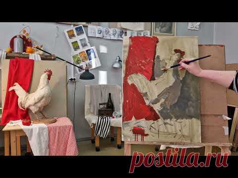 В комнате изображена сцена, где художник рисует на холсте. На холсте изображена курица, и это выглядит как реальная курица, сидящая на стуле перед холстом. В комнате также видны художественные принадлежности, такие как палитра, краски и кисти, а на стене висят различные изображения для вдохновения.