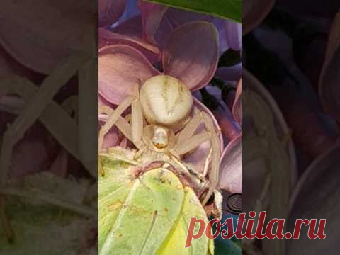 На изображении виден паук, окрашенный в белый цвет, который маскируется среди цветов и листьев. Вокруг паука разные оттенки зеленого и фиолетового, что делает его маскировку эффективной.