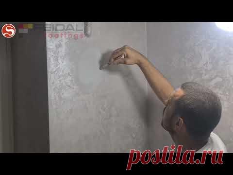 Человек выполняет отделочные работы, нанося шпатлевку или декоративную штукатурку на стену. На заднем плане видна надпись "postila.ru"