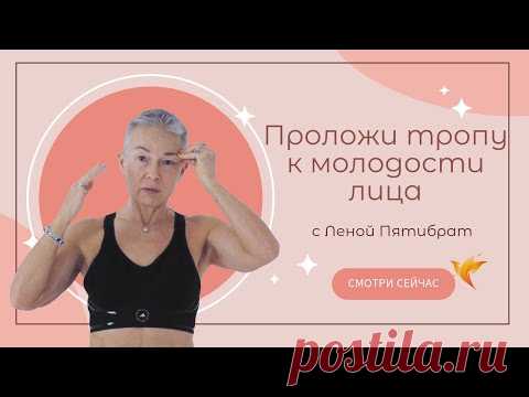 На изображении представлена женщина с короткими светлыми волосами, одетая в спортивный топ, которая делает упражнение для лица. Она касается кончиками пальцев области вокруг глаз. Фон содержит текст на русском языке, который предлагает "Проложить тропу к молодости лица" с кем-то, чье имя упоминается в тексте. Внизу есть кнопка с надписью "смотри сейчас" и логотип в нижнем правом углу, указывающий на источник контента.