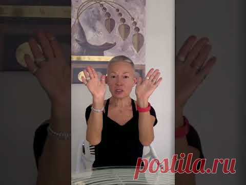 На изображении женщина, поднимающая руки вверх и показывающая ладони в сторону камеры. Она одета в черный верх с открытыми плечами и носит браслеты. На заднем фоне видна картина с абстрактным рисунком.
