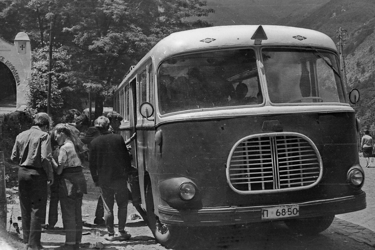 Черно-белое изображение старого автобуса с людьми рядом, стоящими на дороге у подножия горы.