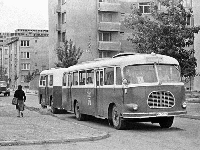 На черно-белой фотографии изображен старый автобус с прицепом на фоне многоквартирных жилых домов. Вид сбоку. На дороге проходит человек.