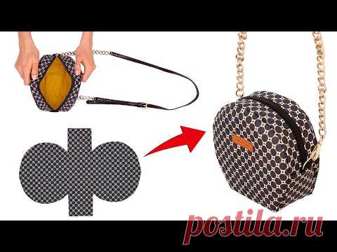Изображение демонстрирует преобразование плоской сумки-клатча в трехмерную сумку через процесс складывания. Слева - раскрытая плоская форма сумки, справа - собранная сумка в форме сферы на цепочке.