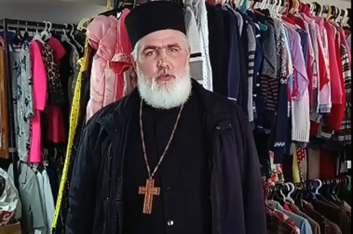 Мужчина в рясе и с крестом на груди, вероятно священнослужитель, стоит на фоне вешалок с одеждой.