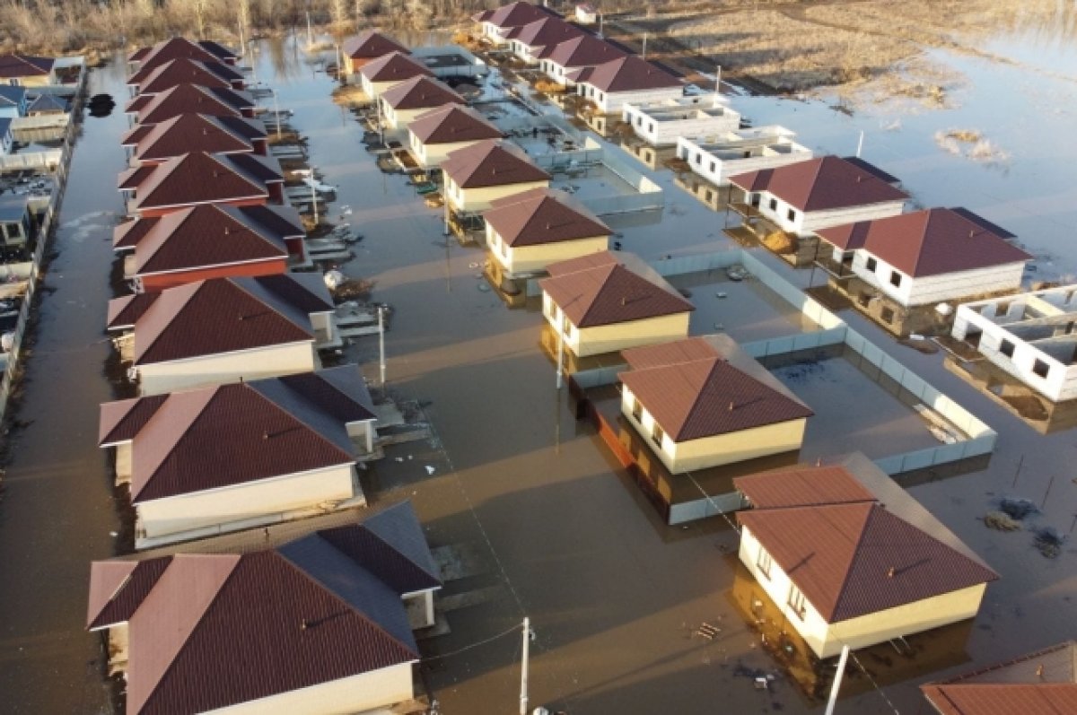 Жилой район, затопленный водой, вид сверху. Дома частично погружены в воду в результате наводнения.