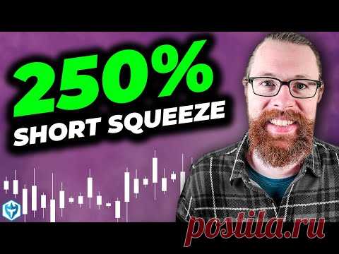 На изображении представлена мужчина с бородой и улыбкой в очках. За ним фон с текстом "250% SHORT SQUEEZE" и графиком цен акций. Основные цвета - фиолетовый и зеленый. Изображение, возможно, используется для обозначения финансового термина "шорт-сквиз" или для обсуждения тем, связанных с фондовым рынком.