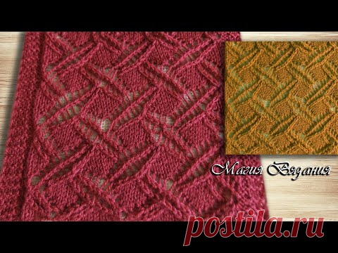 На изображении представлены образцы вязания с узорами. Слева виден крупный фрагмент розового цвета с выпуклыми линиями и диагональными переплетениями. Справа - меньший образец зеленого цвета с похожим узором. Оба образца выложены на светлом фоне. Внизу изображения присутствует текст.