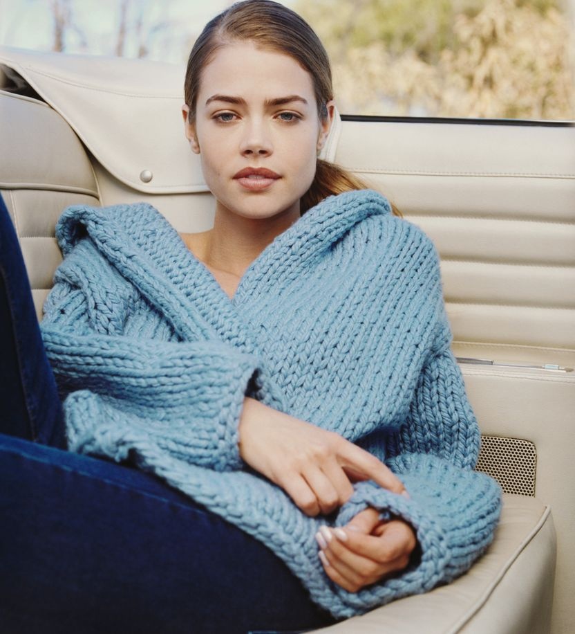 Молодая женщина сидит на заднем сиденье автомобиля и укутана в голубой вязаный свитер. У нее светлые волосы и она смотрит прямо на камеру с легкой улыбкой.