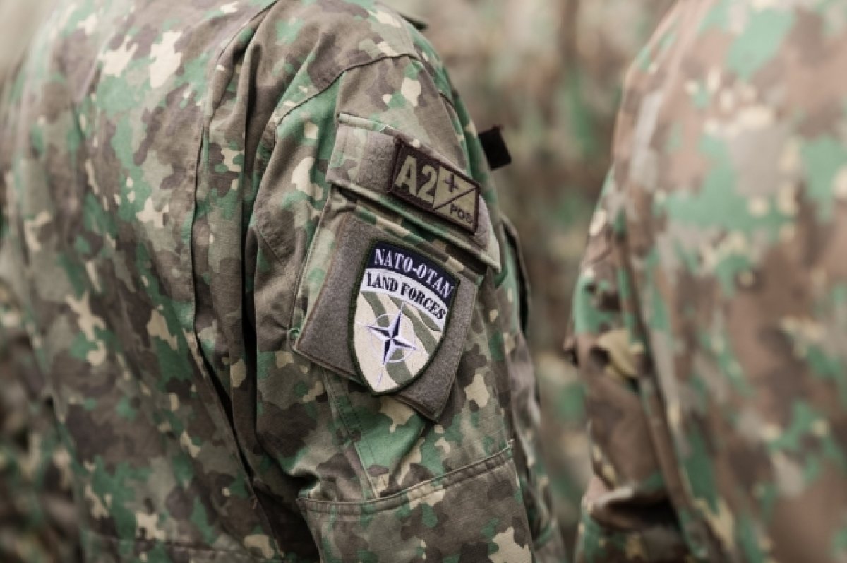 На изображении крупный план части военной формы с нашивкой НАТО (North Atlantic Treaty Organization). Видна камуфляжная ткань и шеврон с логотипом НАТО и надписью "NATO RESPONSE FORCE LAND FORCES".