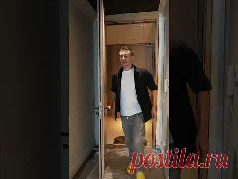 На фотографии изображён мужчина, стоящий в дверном проёме внутри здания. Освещение в комнате мягкое, создаёт домашнюю атмосферу. Мужчина одет в повседневную одежду: светлые брюки и чёрную куртку поверх белой футболки. Его выражение лица и поза выглядят дружелюбно и непринуждённо.