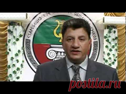 Мужчина в костюме стоит перед эмблемой с надписями на кириллице. Он выглядит серьезным и говорит в камеру.