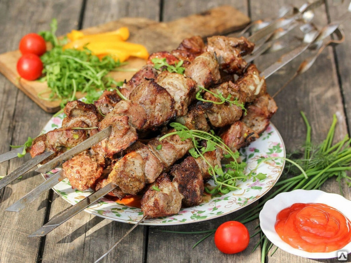 На изображении представлены шашлыки на металлических шампурах, поданы на тарелке с зеленью на деревянном столе. Рядом лежат свежие томаты, сладкий перец и салат. На переднем плане видна тарелка с кетчупом.